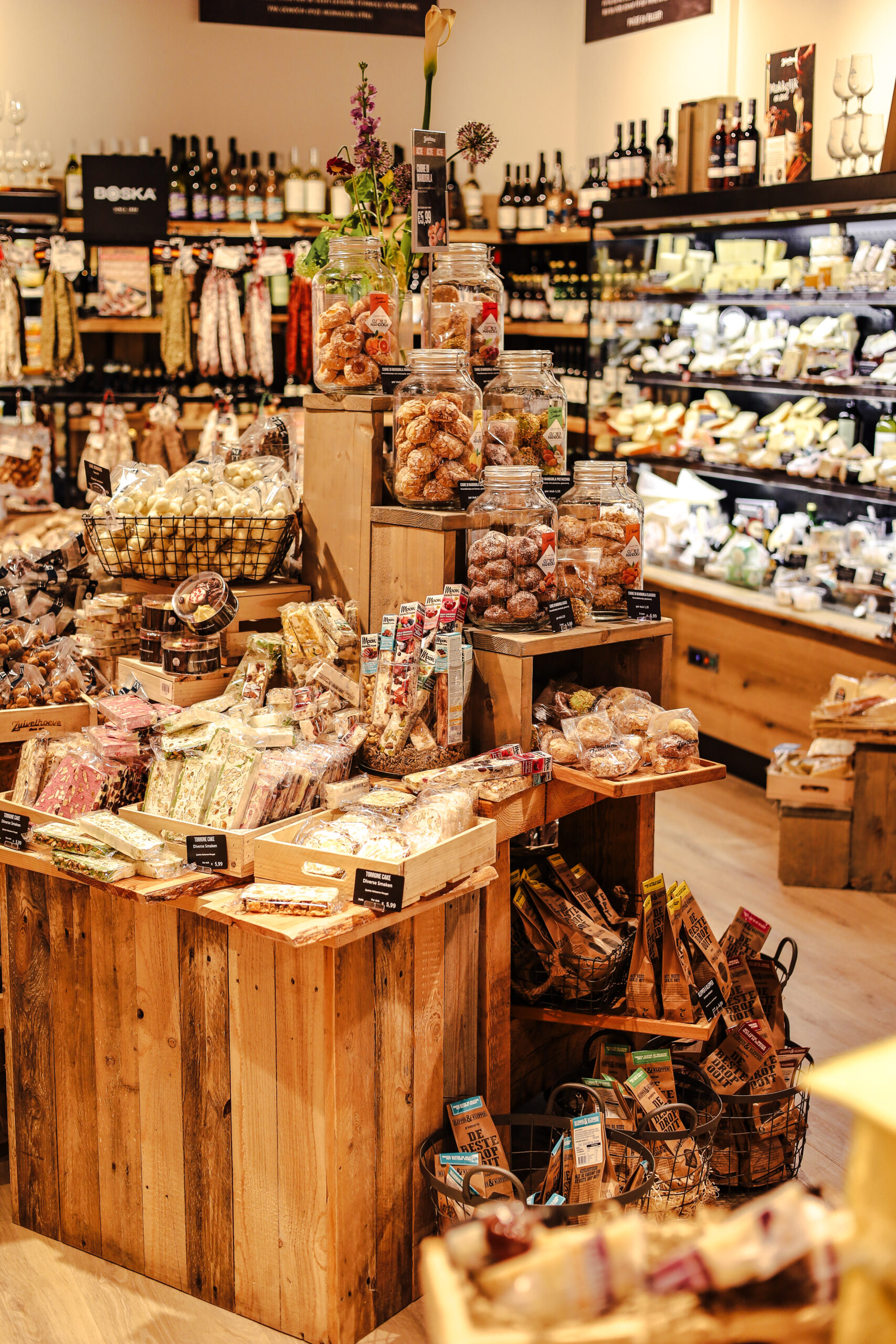 In onze winkel, waar gezelligheid en kwaliteit de boventoon voert, verkopen wij een divers assortiment aan lekkernijen; Hollandse- en buitenlandse kazen, noten, worsten, olijven, tapas, wijnen, chocolade, zuivel en vele andere specialiteiten. Daarnaast verzorgen wij ook (cadeau)pakketten, borrelplanken én relatiegeschenken. (H)eerlijke producten en voor iedere maaltijd, op ieder moment en bij iedere gelegenheid; want als je weet wat je eet, proef je meer.